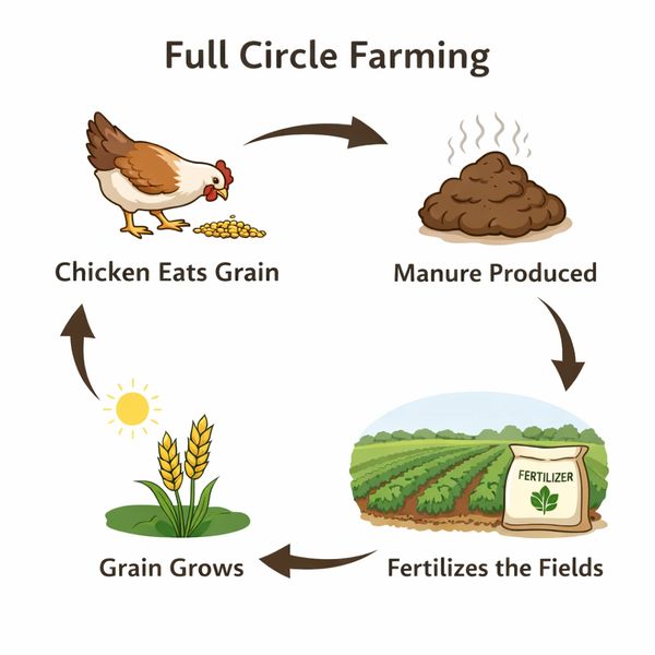 Sustainability comes full circle on our farm. The natural fertilizer generated by our hens is returned to the land and used to enrich the very fields that grow our grain. This closed-loop approach improves soil health, reduces waste, and helps maintain productive farmland for future generations.